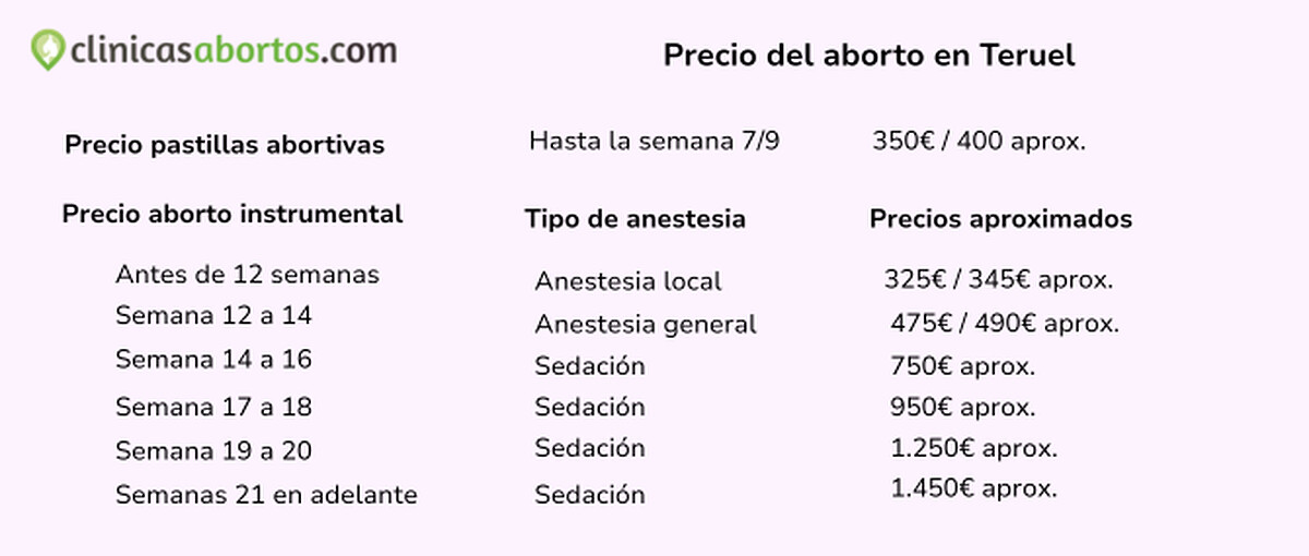 04/02/2026 | Abortar en TeruelAborto con pastillas: El precio suele situarse entre 350 € y 400 €. Es un método eficaz en las primeras semanas de embarazo (aprox. has...