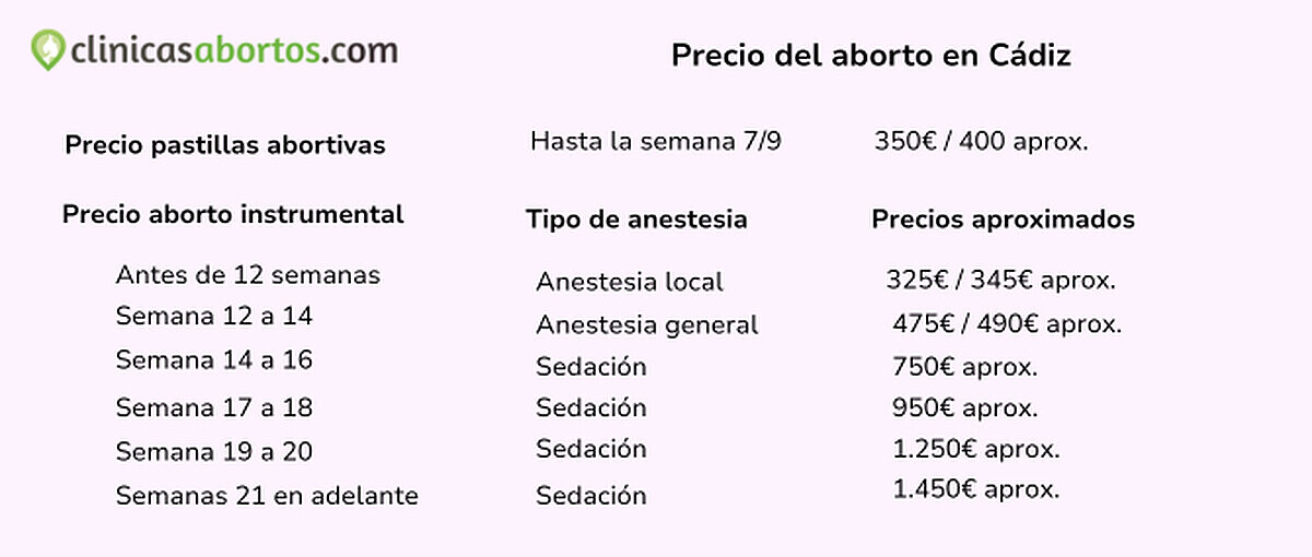 03/02/2026 | Abortar en CádizAborto con pastillas: El precio suele situarse entre 350 € y 400 €. Es un método eficaz en las primeras semanas de embarazo (aprox. has...