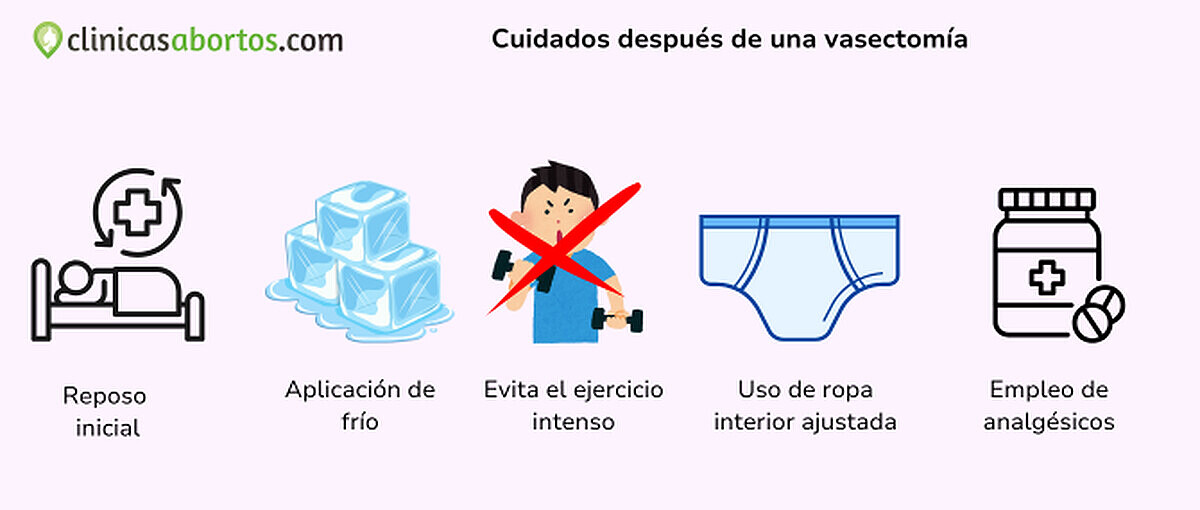 La recuperación después una vasectomía suele ser rápida y con molestias leves. Se recomienda reposo durante las primeras 24-48 horas, aplicar frío en la zona para reducir inflamación, evitar esfuerzos físicos intensos durante unas dos semanas y usar ropa interior ajustadapara mayor soporte. Es normal sentir una leve molestia testicular, que puede aliviarse con analgésicos indicados por el médico.
